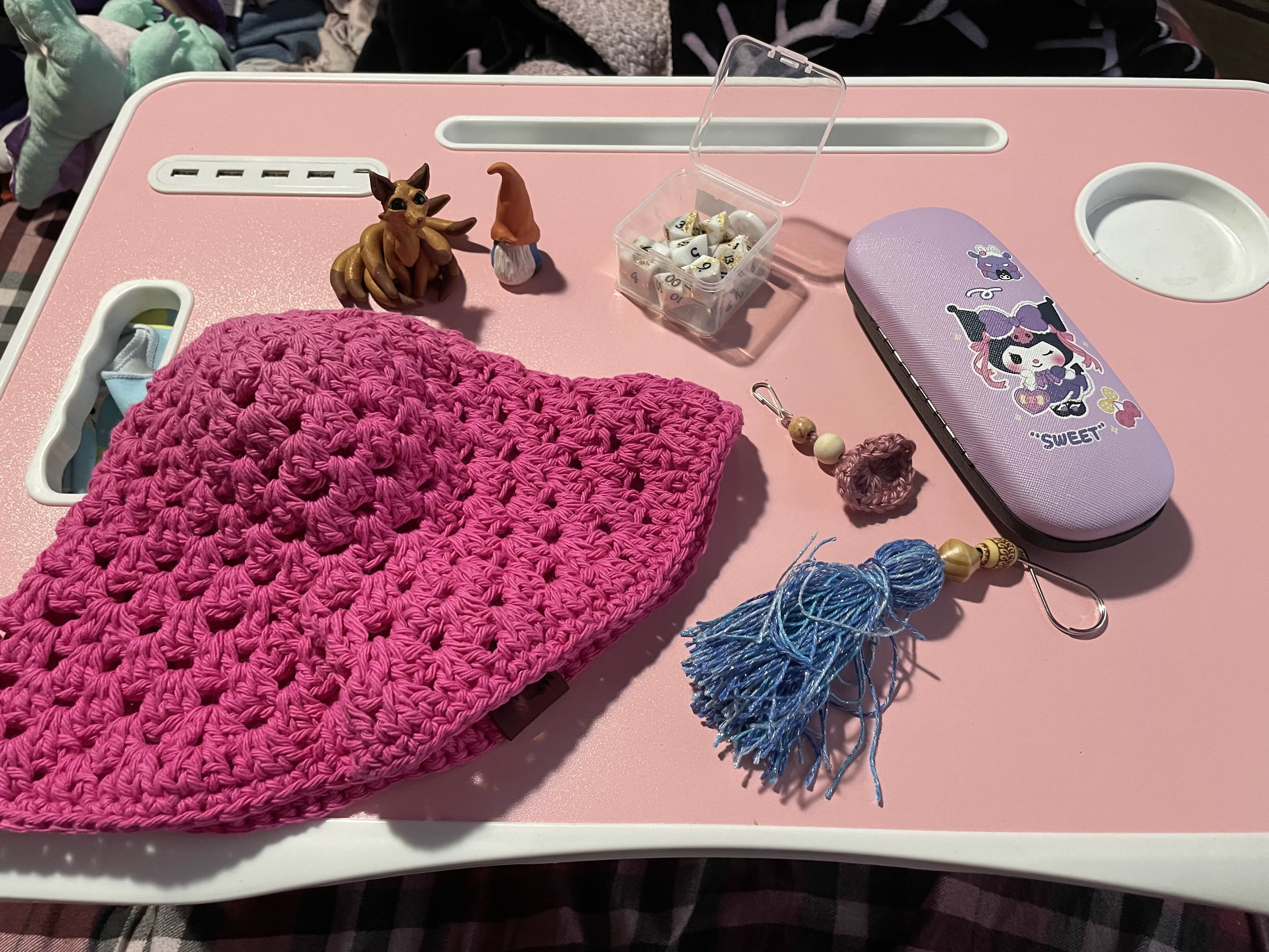 i thought the dice would be perfect for candace. the crochet items were part of a grab bag and i really like them! i don't think i've ever owned a bucket hat. i can't tell if it's a little small though or if that's just how they fit on your head.