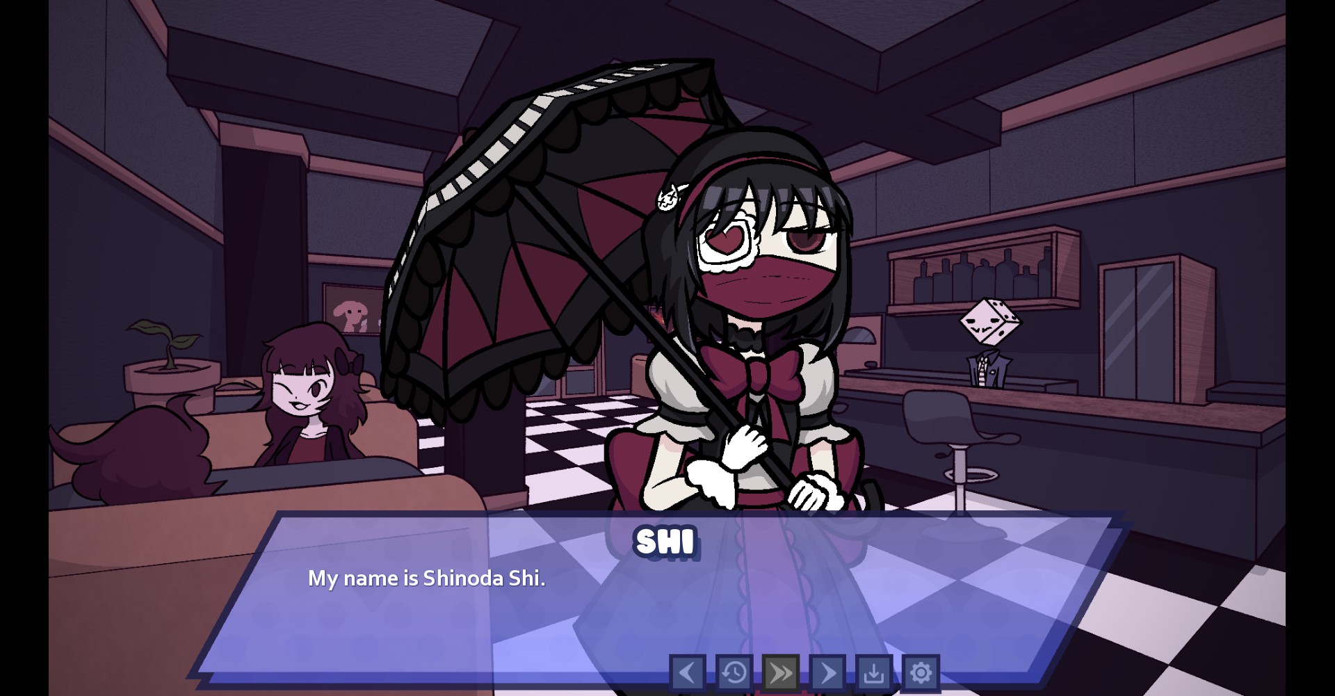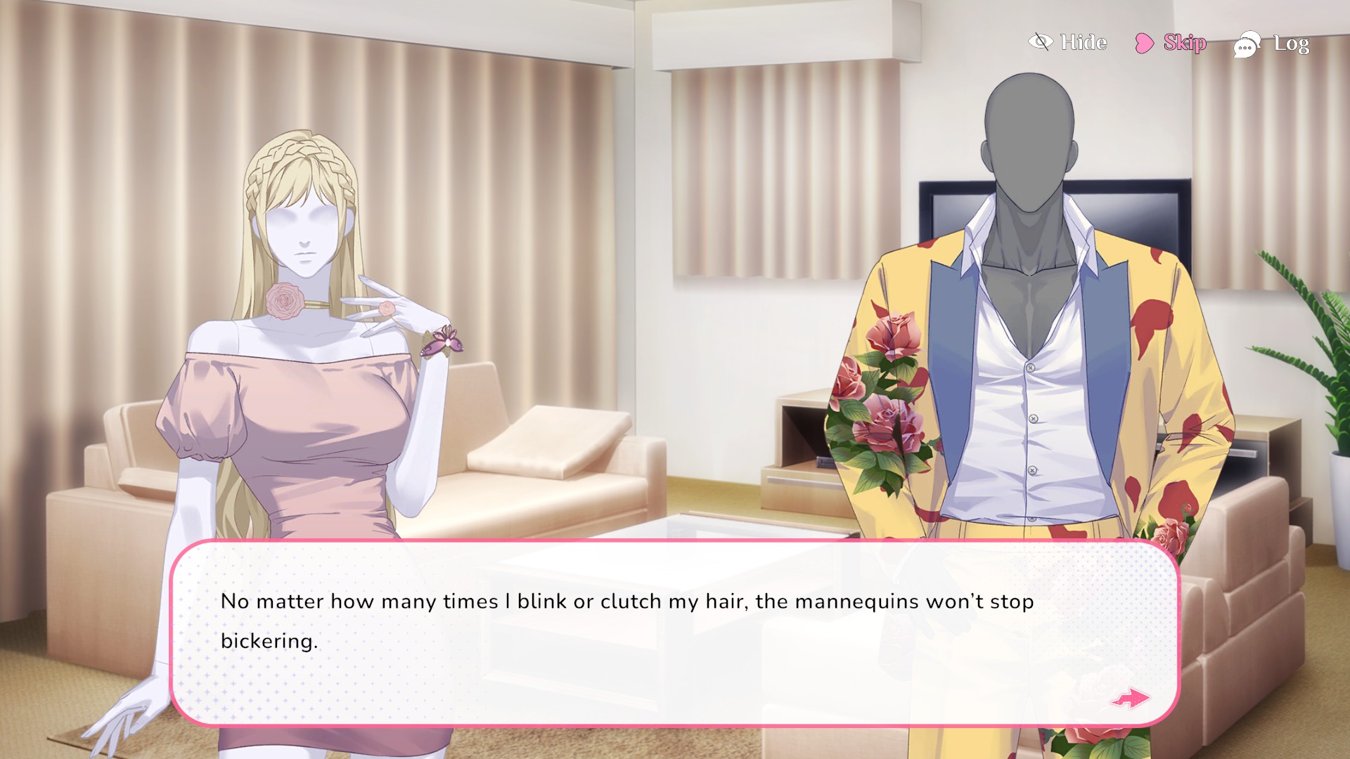 this is an entirely goofy premise, but the game plays it surprisingly straight. the mannequins all have distinct personalities and i can tell they're bound to get more fleshed out as the game goes on. the writing doesn't have the same kind of silly tone you'd expect from a game like this; rather than loading the game up with fourth wall-breaking nods to how weird and crazy the idea is, it's taken seriously. i really appreciated this! i don't mind stuff like that, but it's honestly funnier when the game isn't taking time that could be dedicated to story with wink-wink-nudge-nudging the audience, not to mention the fact that it gives us the opportunity for a more genuine story.