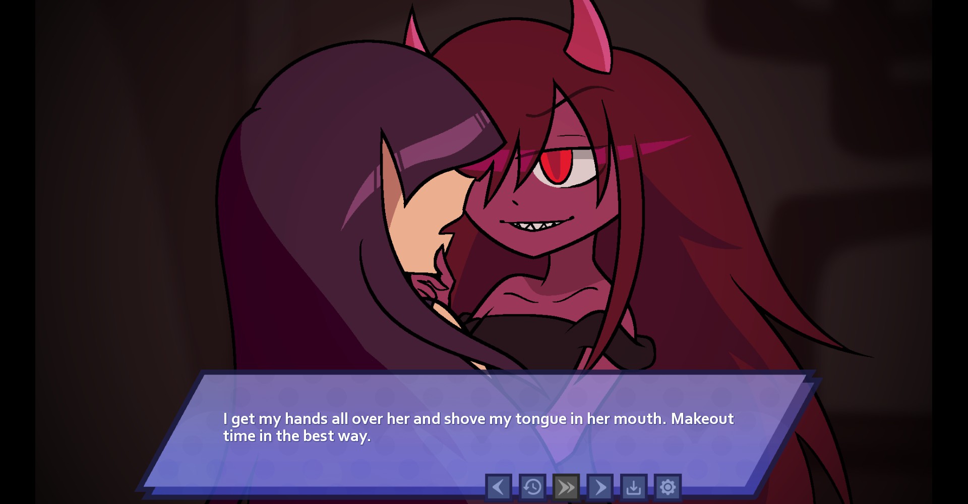 my next choice was leba, who is my alternate evil self. she's pretty sensitive about this, but that's fair because apparently evil selves get a lot of flack. we made out in the boiler room, but i made one too many social faux pas and she took off in a huff. unfortunate, but hopefully i can make it up to her in the full game.