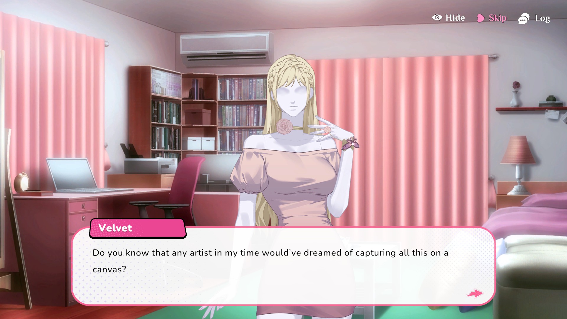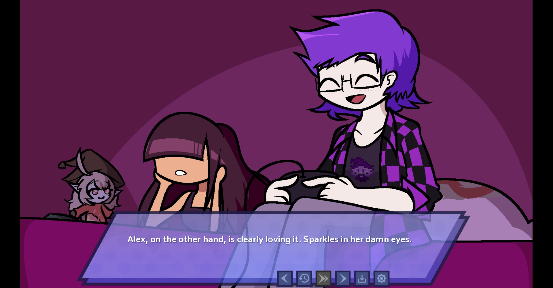 then i talked to alex. she's a nerdy maintenance worker for the airship and she romanced me by playing an old video game for me. she's obsessed with a character called oomfie, which is a silly name but a relatable sentiment. we snuggled while she played and then we chatted until we passed out. shi may be my favorite design-wise and i love her mystery, but alex's route was definitely the sweetest. i love them.