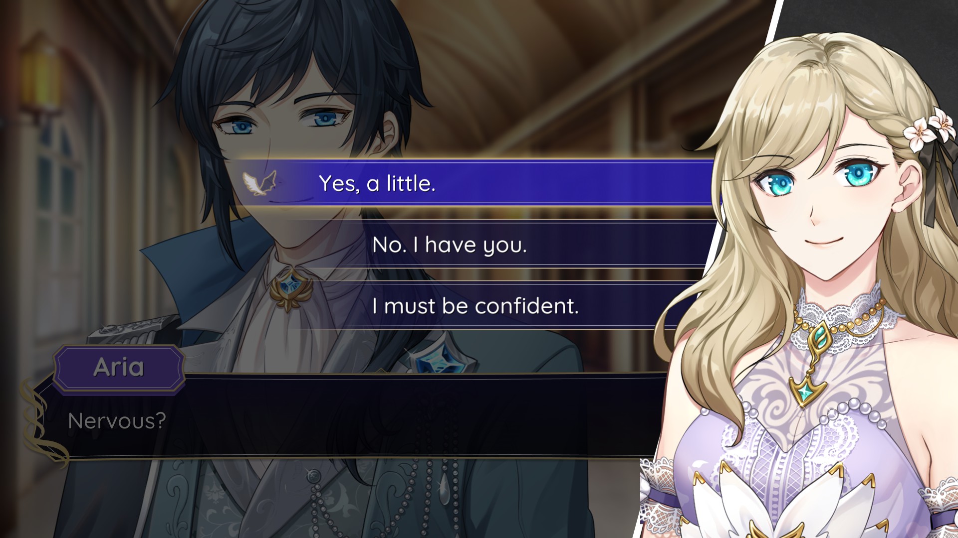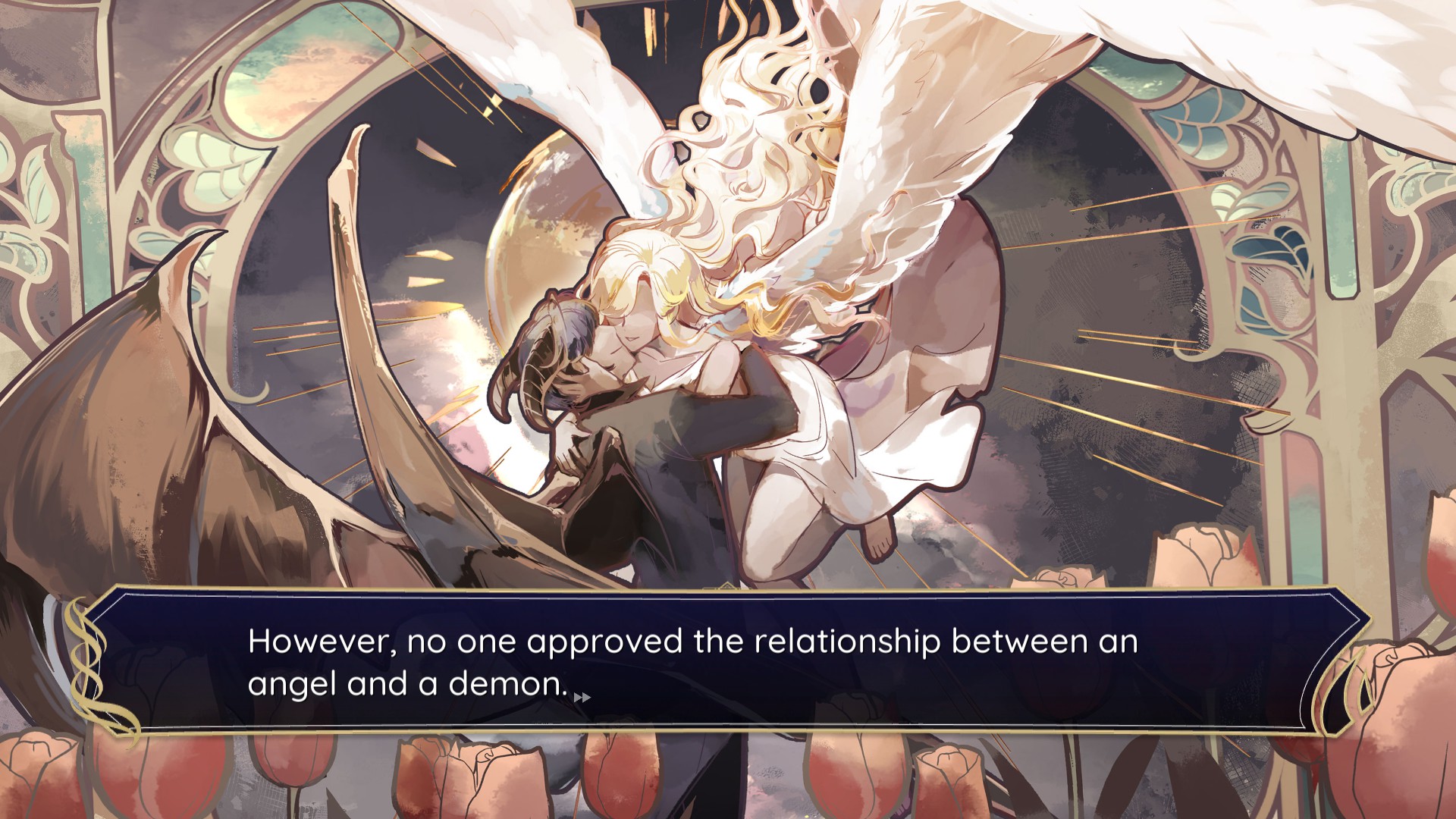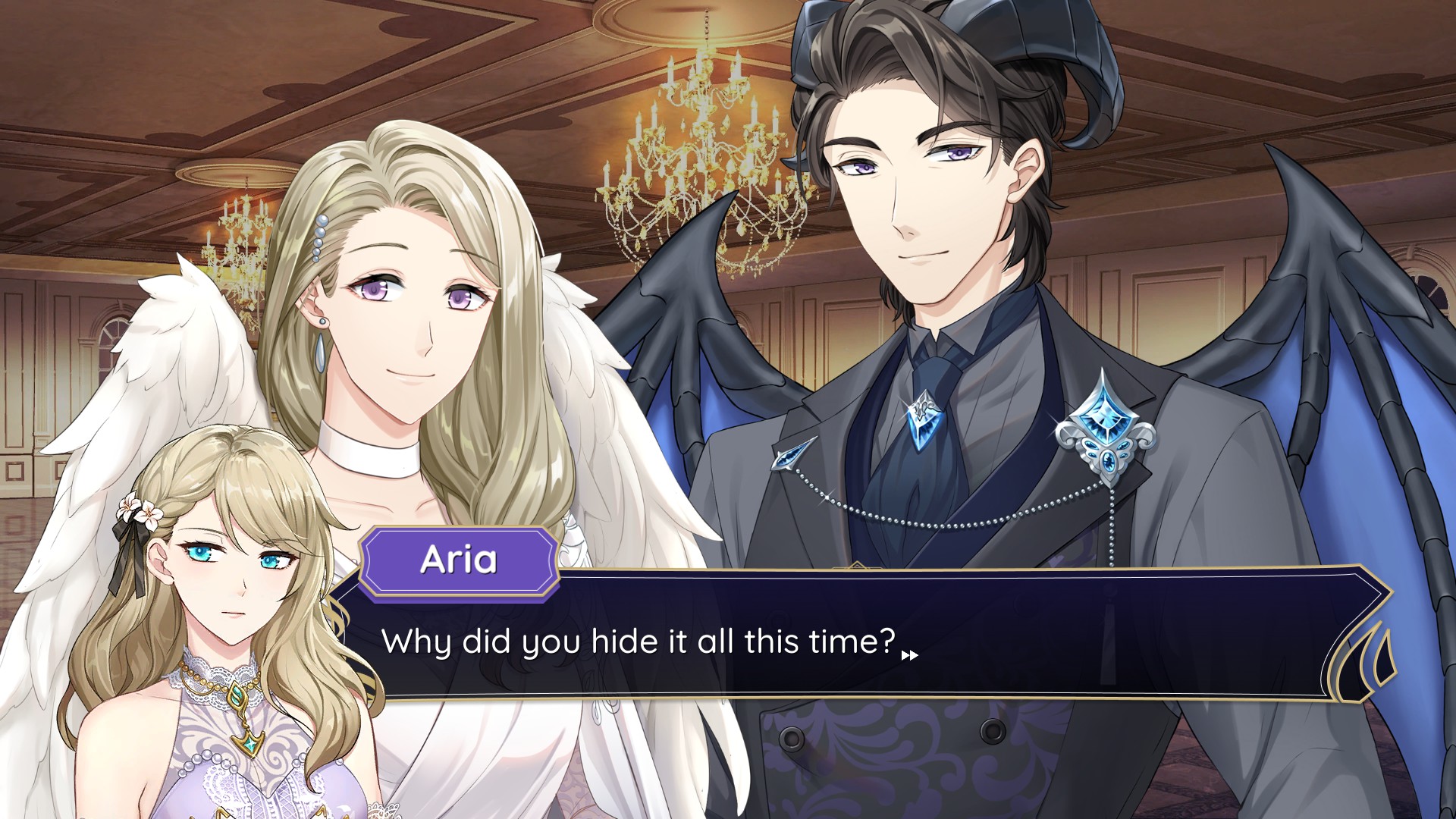 today's first game is celestia. it's a really pretty visual novel starring aria (name changeable), the daughter of an angel and a demon. on her 18th birthday, she gets an invitation to celestia academy, a school of magic for angels and demons - or angelus and daemon, as they call themselves. i didn't get far in this demo since i wanted to play multiple demos today, but i really enjoyed what i played!