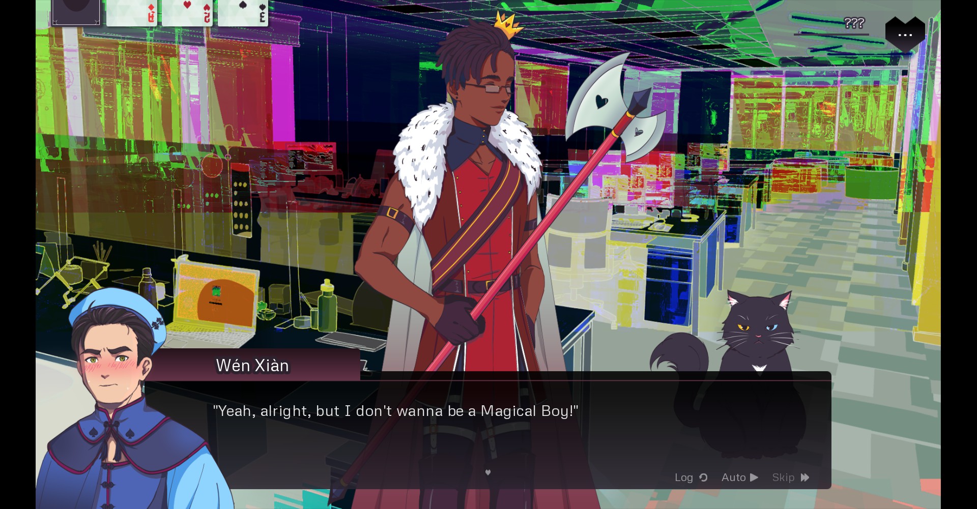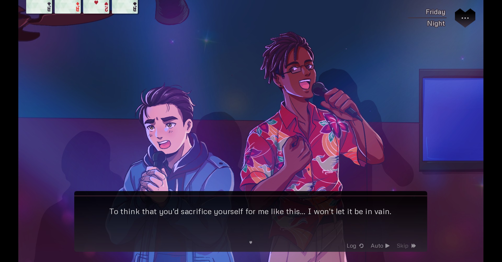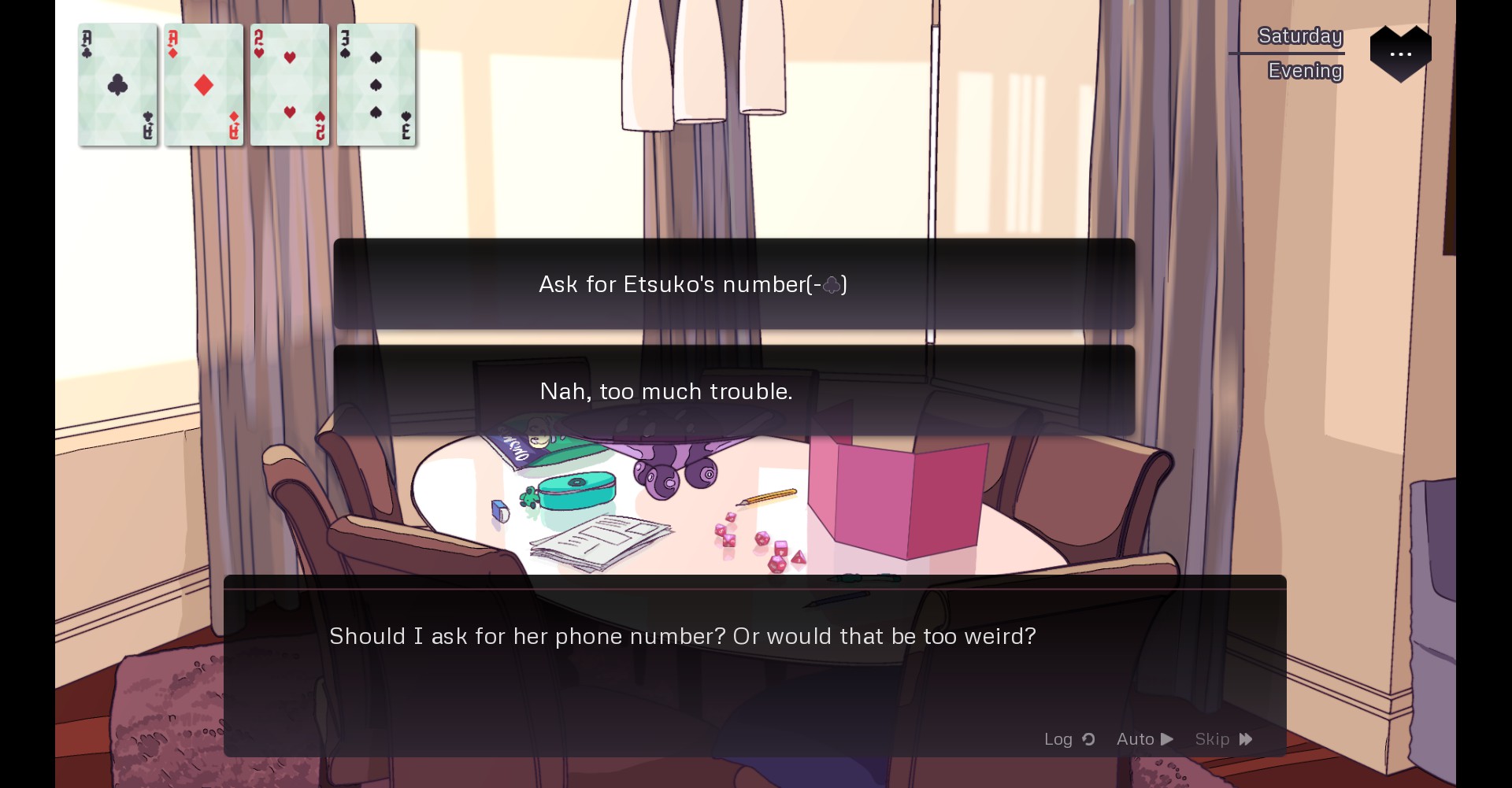 to make choices, rather than skill checks, this game utilizes a simple tarot-based system. you start out with one of each suit of cards and you can gain more depending on certain options you pick. certain options also require you to spend some of your cards. the game explains this right off the bat, though you can skip it if you've played before, then showcases the system with a memory-based dream sequence. i thought this was pretty effective; it's simple and doesn't take too much time, and the dream also gives you a glimpse into wen's character. in high school, he was struggling with some kind of relationship; the demo never explains if this was a romantic partner who was monopolizing all his time or perhaps someone who was struggling and needed his help. either way, he wasn't honest about it with his friends, which put a strain on his other friendships. i'm sure the full game expands on this, but the glimpse i got already said quite a bit.