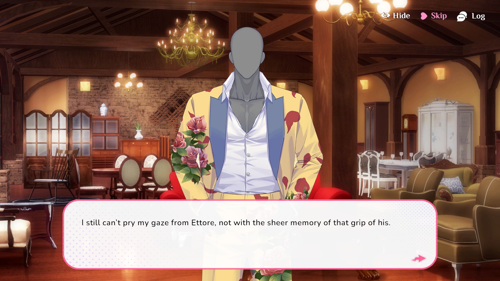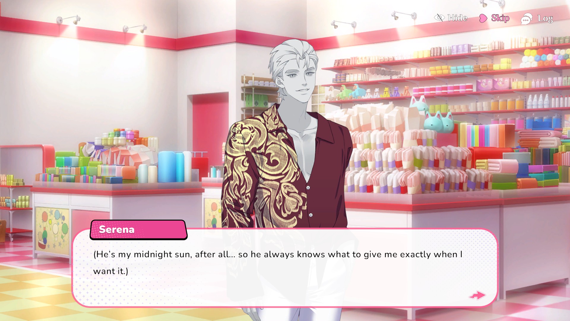 this game has three love interests: ettore, a buff, haughty man who speaks like he's from another planet; velvet, a fashion-forward woman stationed at serena's favorite store; and midnight vaden, a mannequin modeled after a movie star with a big ego. velvet is my favorite by far, but i ended up on midnight's route the first time. to determine what path you take, you go shopping every day. different items will fill up different characters' progress bars. a good sale will fill up serena's progress bar. i'm not feeling the best tonight, so i only played a couple days past the first one. rather than following a linear story from day to day, the routes i ended up on determined how the night of the common route ended.
