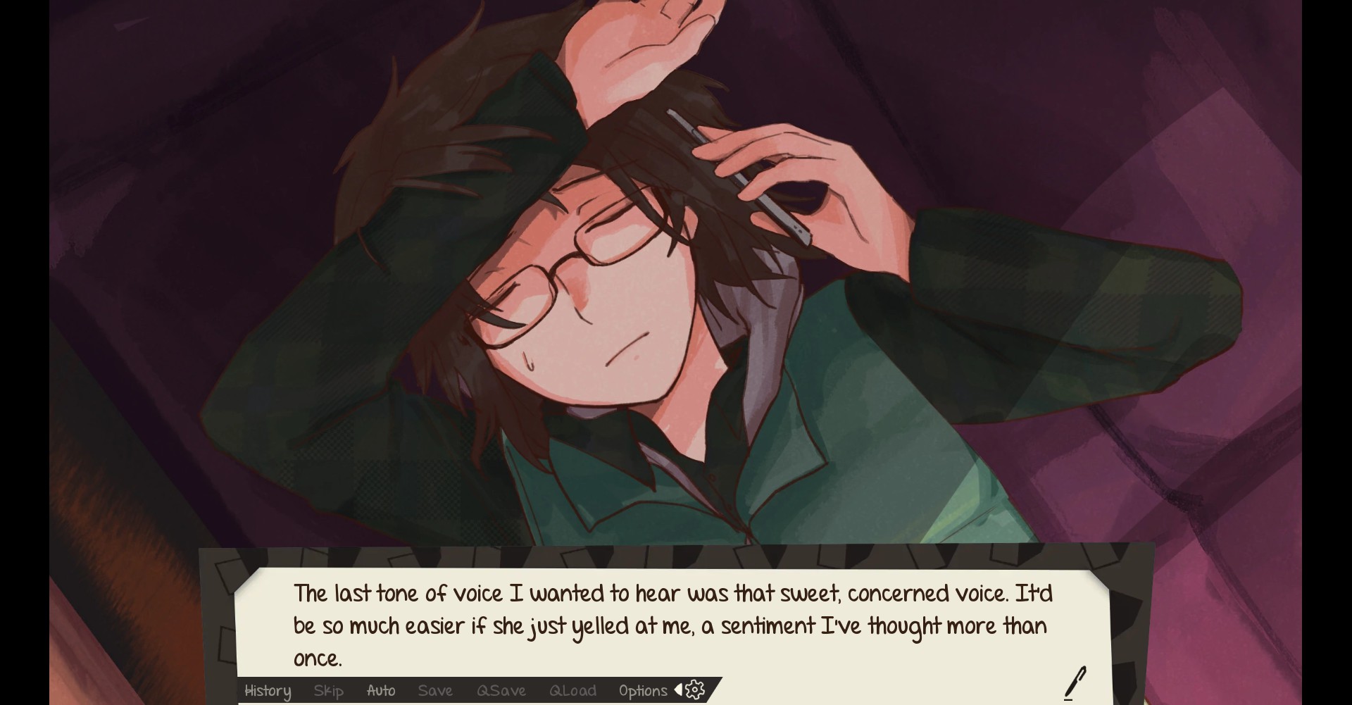 this game is sooo good so far but man did the first part prologue stress me out. i also struggled with college for a while and i completely related to olive's struggles. i was dying when they called their mom to tell her about their gpa. i mean this all with a lot of love, though. it's great when a game can make you feel something, even when that something is dread. at least their mom was chill about it.