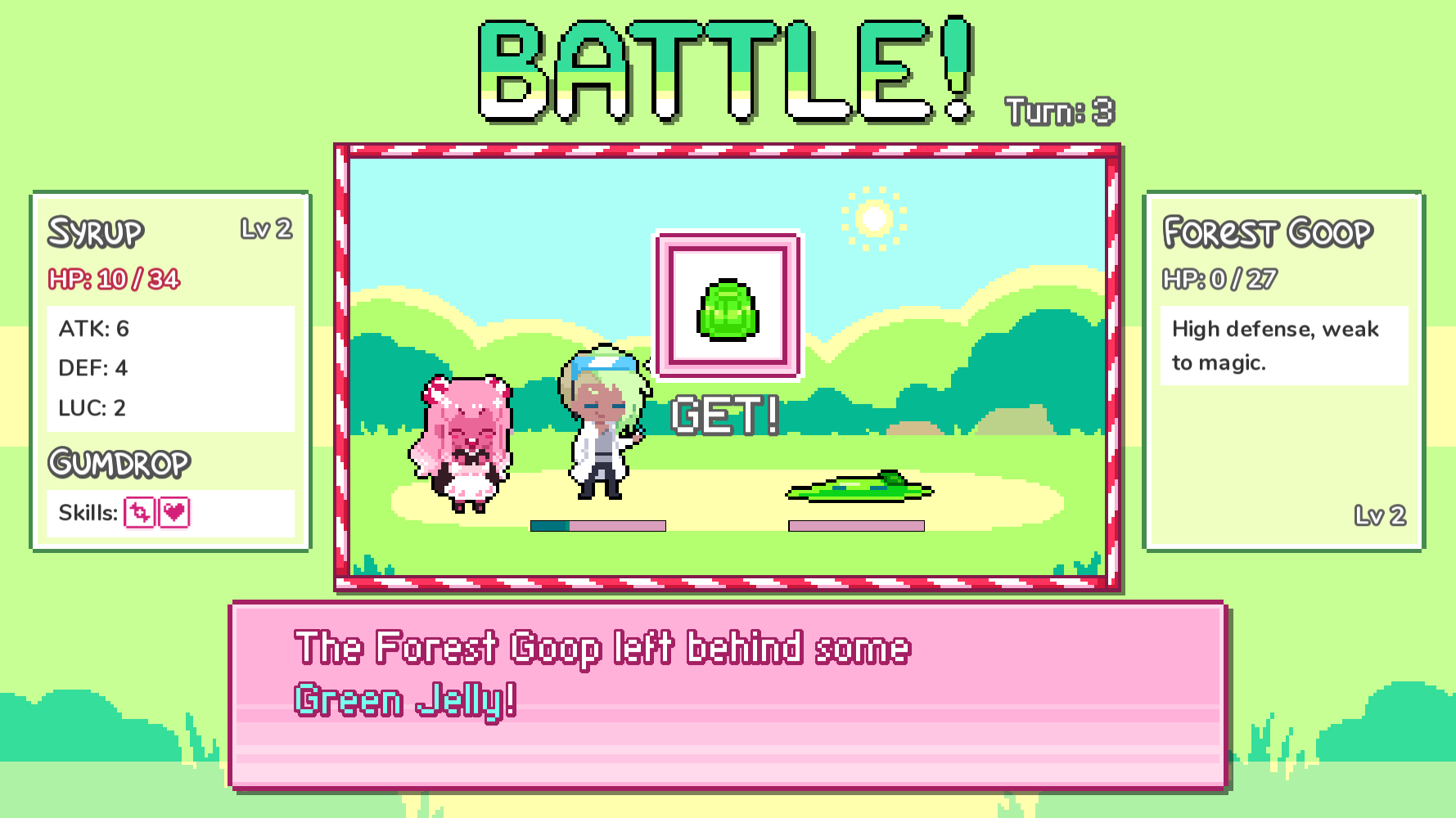 syrup 2 features battles, ingredient gathering, and alchemy. you fight and gather to find the ingredients you need to make candy, then you go home and use alchemy to craft your treats. some ingredients are also found in the shops. all these systems work in perfect harmony with each other! the battles are simple but fun turn-based events and when gathering, sometimes your partner can find things that syrup can't find on her own.